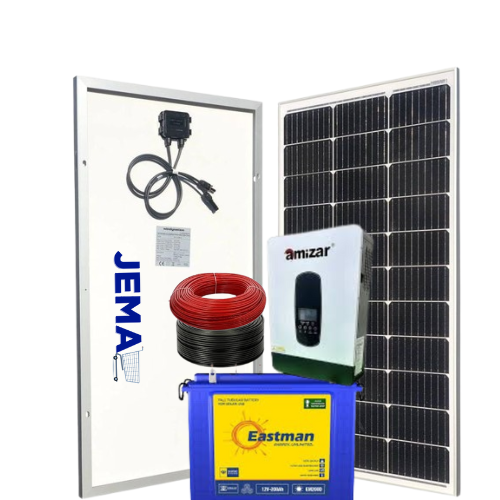 • This kit features a 550W high-performance monocrystalline solar panel, a trusted 200Ah Eastman deep cycle gel battery, a smart 1kVA hybrid inverter, and 20 meters of premium 4mm² solar cable. Ideal for areas with erratic grid supply or no grid access, this hybrid system ensures 24/7 energy availability for devices such as lights, fans, routers, TVs, and more.